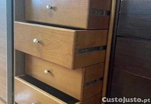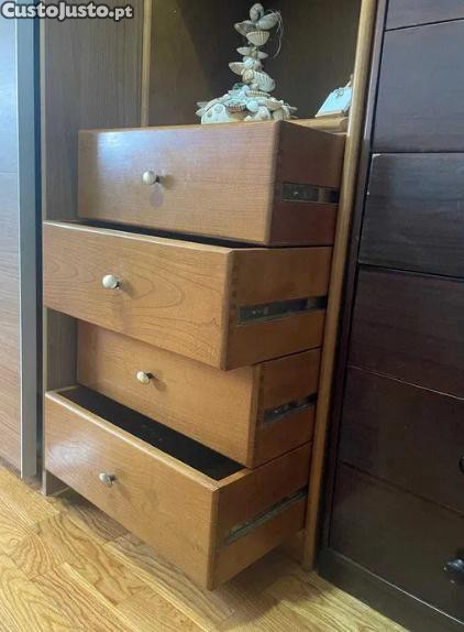 O armário de madeira possui prateleiras e gavetas, sendo ideal para armazenar diversos objetos decorativos, pessoais e roupas.