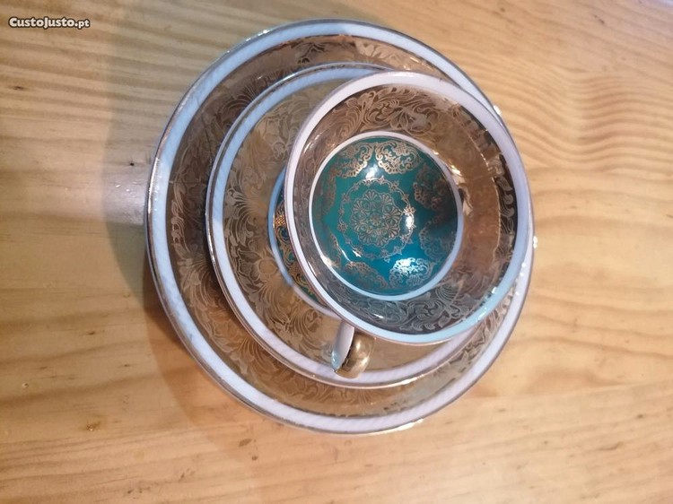 Chávena de chá com pires e prato de bolo, em porcelana Winsterling - Bavária, motivo policromado floral, com ouro e fundo verde.