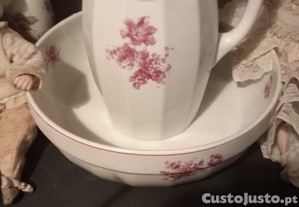 Este conjunto de lavatório antigo é um item interessante e com carácter. Apesar de usado,e ligeiramente quebrado na asa , a sua decoração floral delicada e o seu design clássico conferem-lhe um toque de elegância e nostalgia. Seria uma ótima peça de decoração para dar um ar vintage à sua cozinha