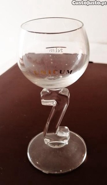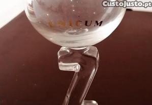 Copo em vidro do licor de ervas Unicum, bebida nacional da Hungria, de 20cl., com marca gravada a ouro.