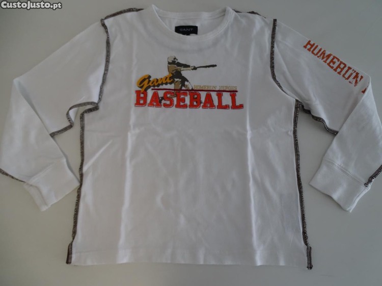 Vendo camisola de manga comprida (long sleeve) da GANT (original), para rapaz. Tamanho M (7-8 anos 122-128 cm), em branco e letras cor de tijolo do Baseball. Decote redondo. Algodão muito macio. Usada. Excelente estado.