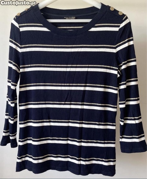 De malha de cor azul marinho ou azul escuro, com riscas horizontais brancas e douradas com fio brilhante. Detalhe de dois botões dourados brilhantes decorativos em cada ombro. De manga de comprimento 3/4, com decote redondo. Modelo mais ou menos justo. Material leve.