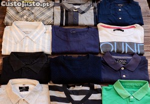 Lote composto por 13 peças/acessórios de roupa de homem em tamanho M, ideal para uso próprio, revenda ou renovação de guarda-roupa. Inclui polos, camisolas, camisas de manga curta e manga comprida, t-shirts casuais e boné Tiffosi Denim azul escuro. Marcas incluídas: Pull & Bear, Zara, Avant Premiere, Berg, Primark, Lefties, Sisley, Andra s e Tiffosi. Conjunto versátil com peças de estilo casual e urbano, adequado para utilização no dia a dia.
