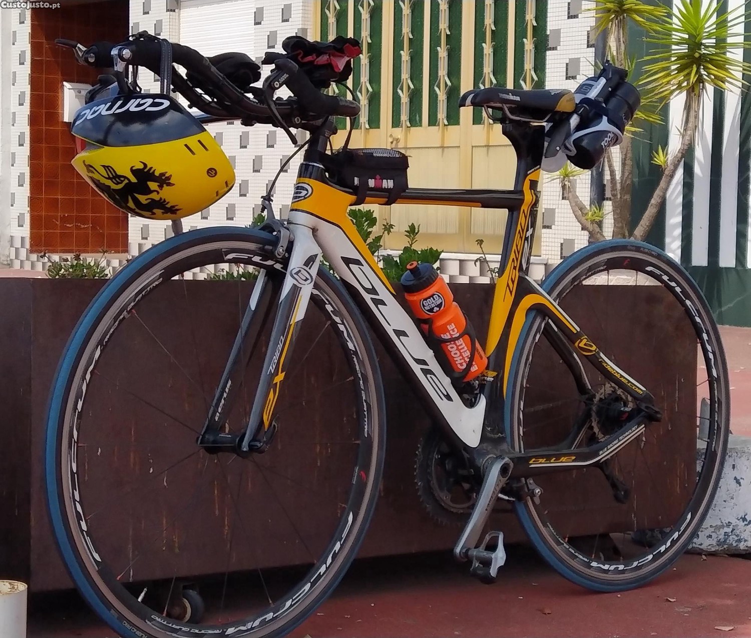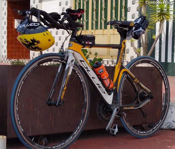 Bicicleta de Contrarrelógio da marca Blue, modelo Triad Ex totalmente em carbono, utilizada apenas em 2 provas da distância Ironman e 2 Half Ironman.