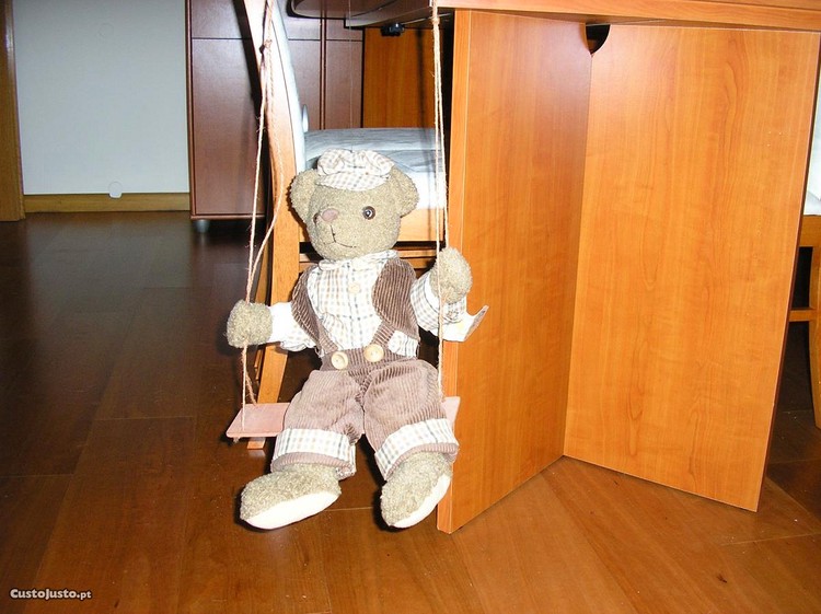 Peluche com roupa e com cerca de 50 cms em tons de bege e castanho. Dá para pendurar ficando sentado