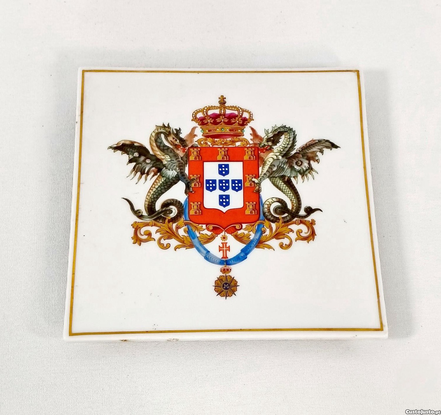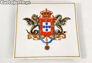 Base em porcelana da Vista Alegre assente em quatro pés decorada com o brasão das armas Reais portuguesas, marcada na base adaptação "Coleção do Palácio Nacional da Ajuda".