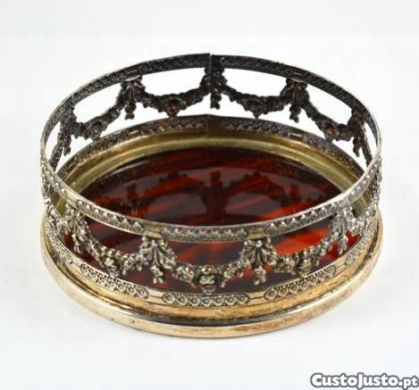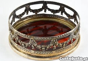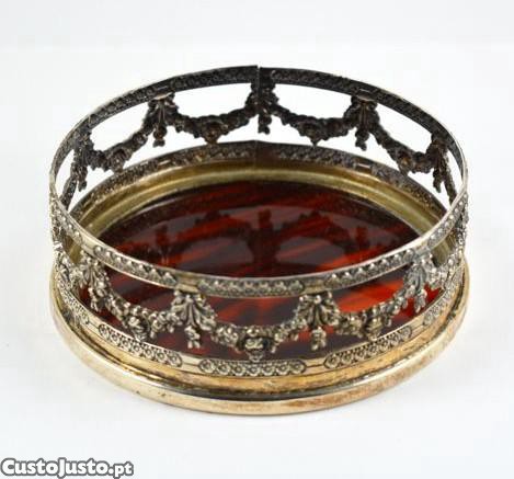 Base de garrafa em casquinha da Topázio com decoração floral vazada e relevada e base em material sintético a simular tartaruga. Marcada.
