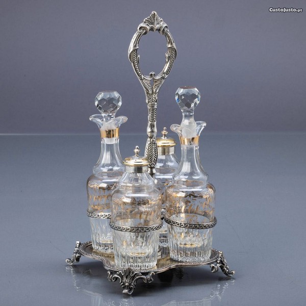 Galheteiro em casquinha relevada de base recortada, galhetas em vidro decorado com dourados.