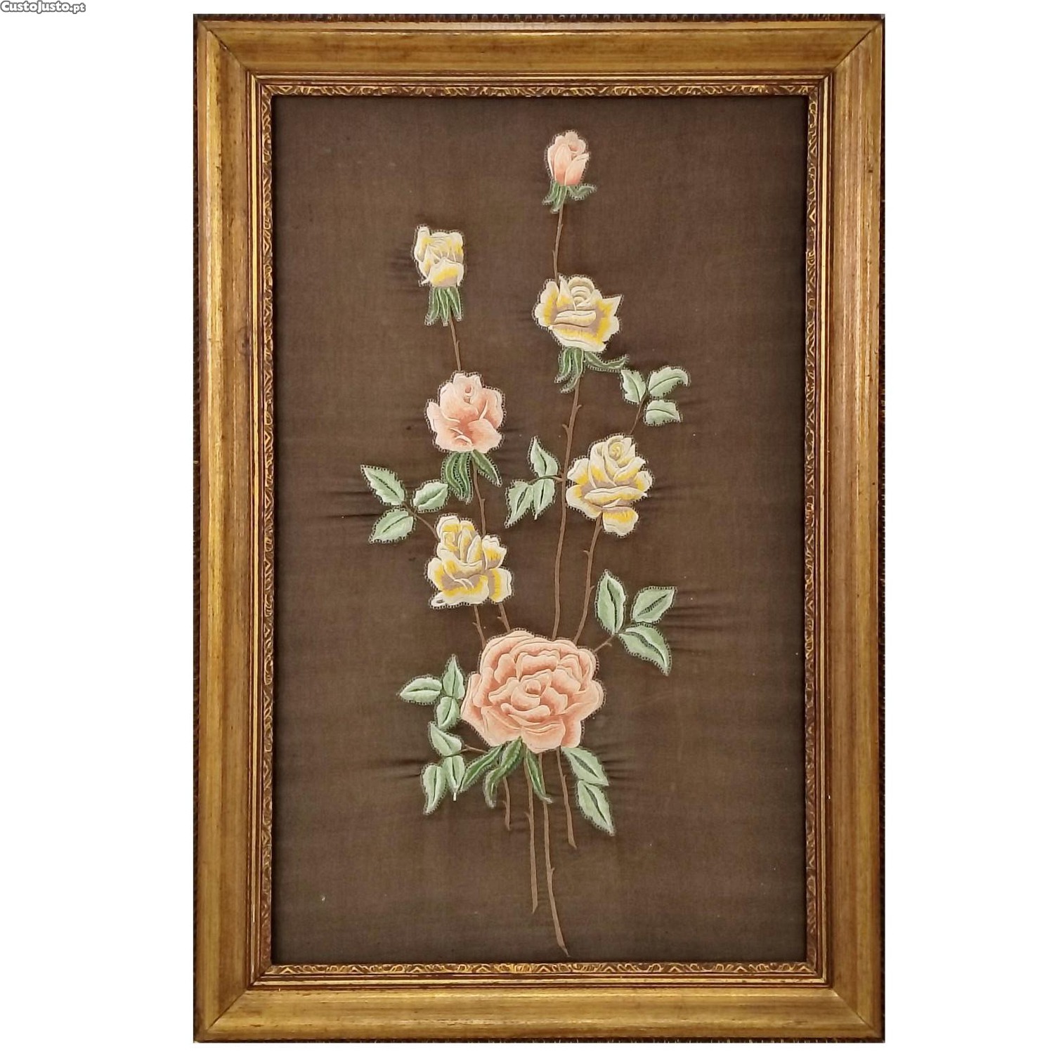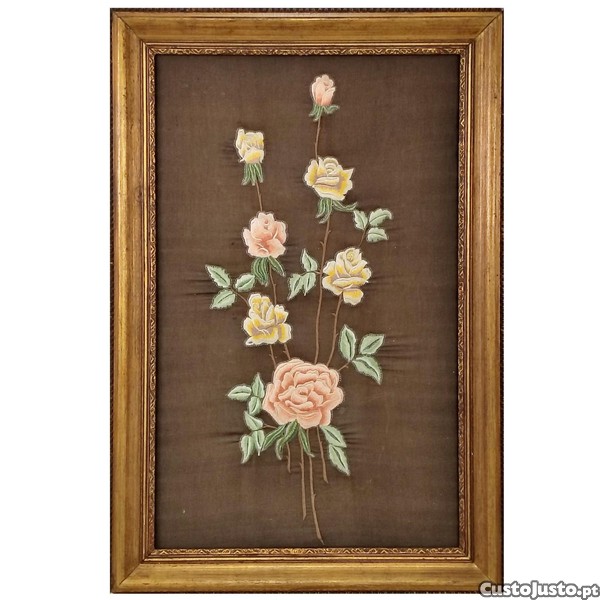Bordado floral em fundo de seda ao estilo de Castelo Branco muito antigo. Emoldurado em talha dourada.