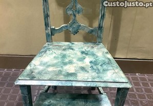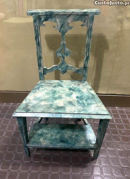 Cadeira genuflexória em madeira marmoreada de verde.