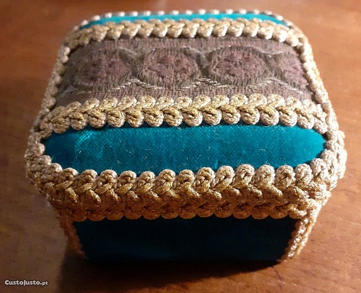 Caixa Octogonal Antiga em Vidro Opalino, revestida a veludo e brocados, em bom estado.