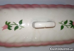 Caixa de escovas em faiança da Fábrica de Louça de Sacavém, cor rosa e branco, com decoração floral na tampa.