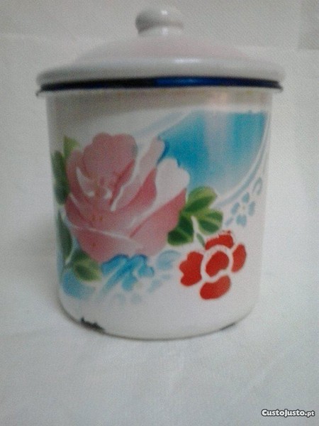 Decoração - Motivo vegetalista, cores azul, verde, rosa e encarnado, tampa com friso rosa, caneca com file azul , tudo sobre esmalte branco