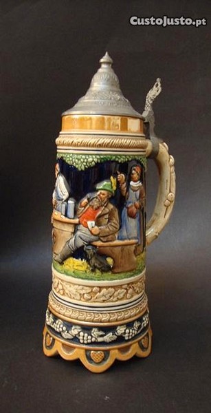 Grande caneca de cerveja em cerâmica, com tampa e com caixa de música incorporada.
