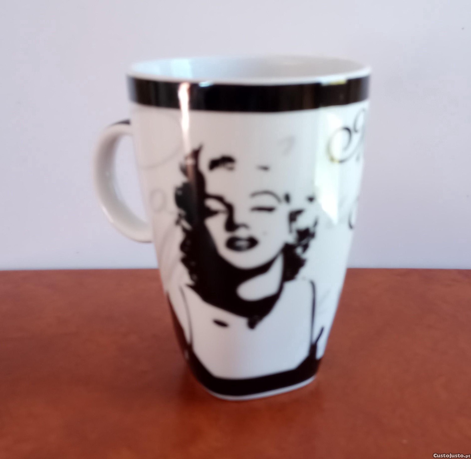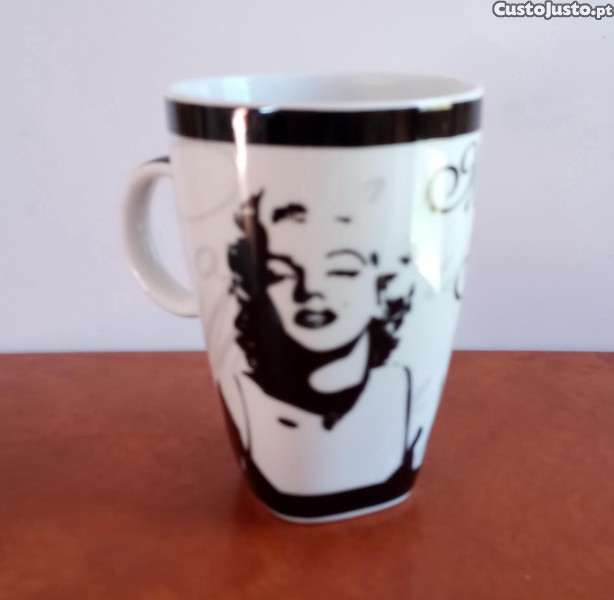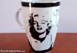 Caneca de cerâmica com a icónica imagem da atriz Marilyn Monroe. Peça decorativa e funcional para os fãs da atriz ou para quem aprecia a cultura pop.