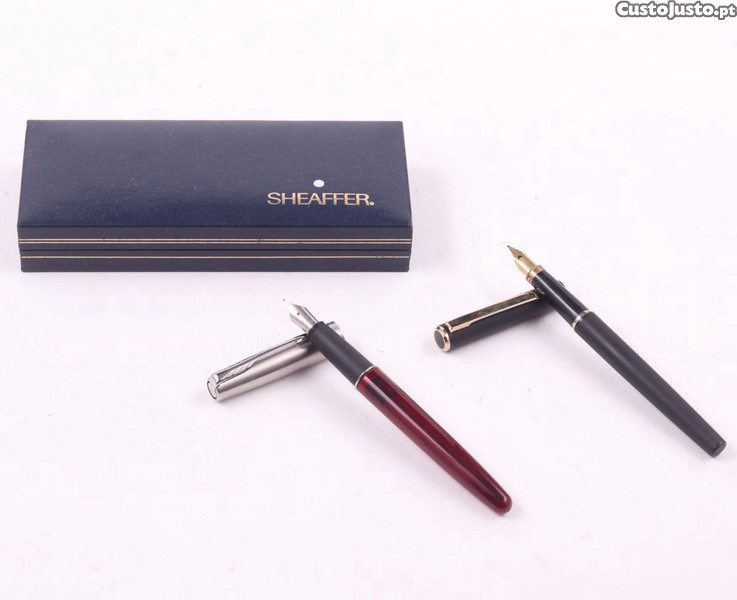Caneta de aparo PARKER FRONTIER, em metal escovado e baquelite. Caneta de aparo Sheaffer em metal lacado, com estojo.