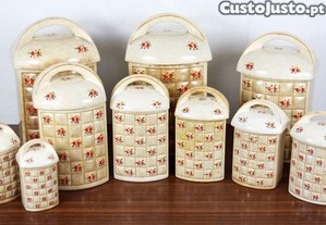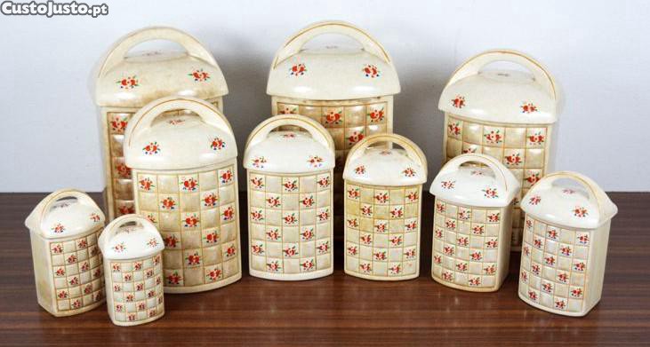 Conjunto de cozinha antigo em faiança da Fábrica de Sacavém composto por 10 Potes com decoração floral policromada. Marcados.