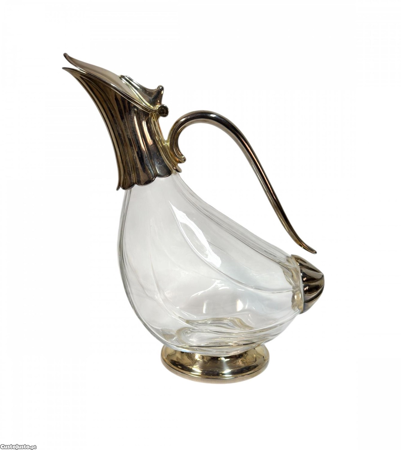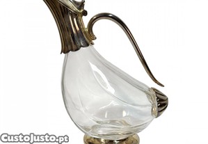 Decanter em vidro e metal prateado.
