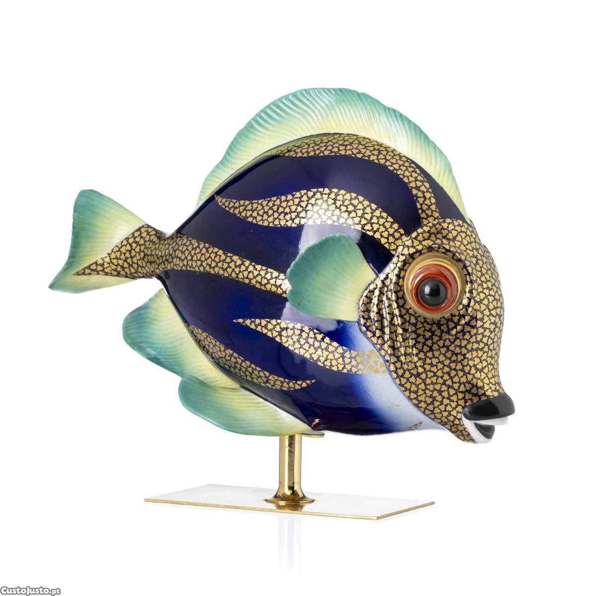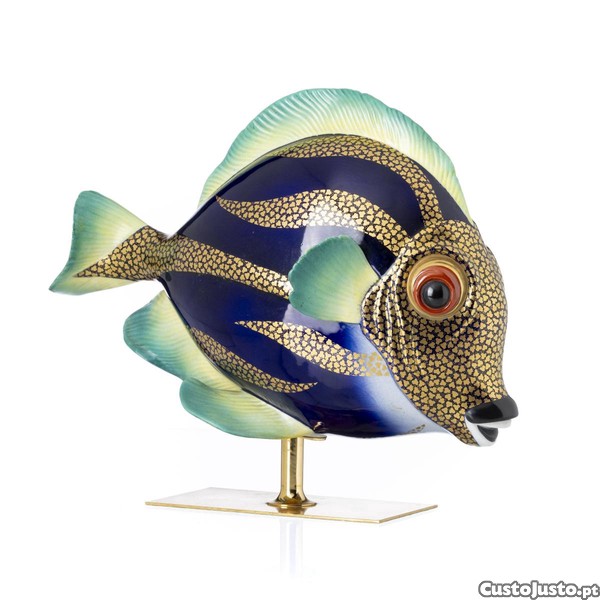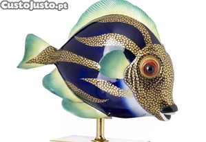 Peixe Tropical - Escultura italiana em porcelana policromada e dourada. Assente sobre base em metal amarelo.