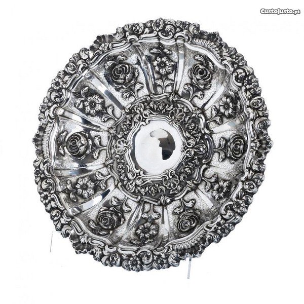 Salva em prata portuguesa, contraste javali, gomada e recortada, decoração relevada de flores, rosas e elementos vegetalistas.