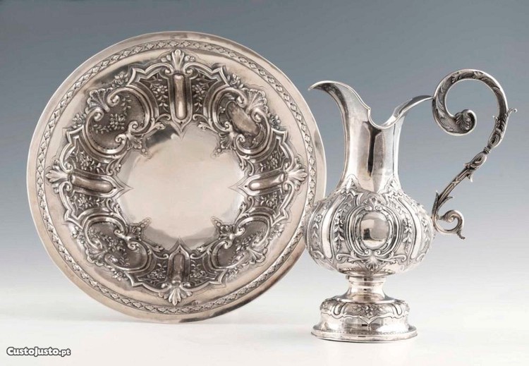 Jarro e bacia em prata portuguesa do séc. XIX/XX. Corpo decorado com concheados e elementos vegetalistas. Marcada e contrastada com punção "Javali".