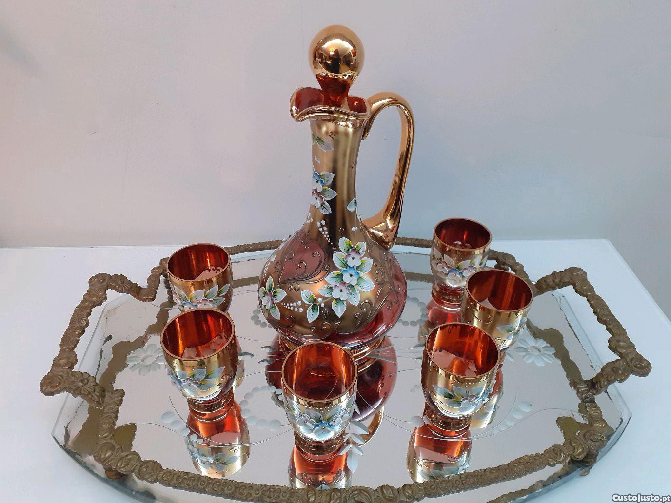 Licoreira com seis copos Murano, pintura a ouro.