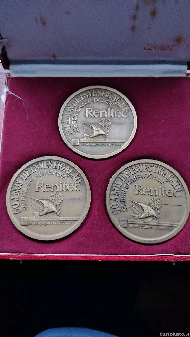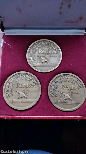 Estojo com 3 medalhas comemorativas da Merck Sharp & Dohme alusivas aos 50 anos de investigação e ao medicamento Renitec.