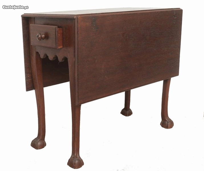 Mesa de abas antiga em madeira entalhada com 2 gavetas, saial ondulado e pernas lisas com pés em forma de garra com bola.