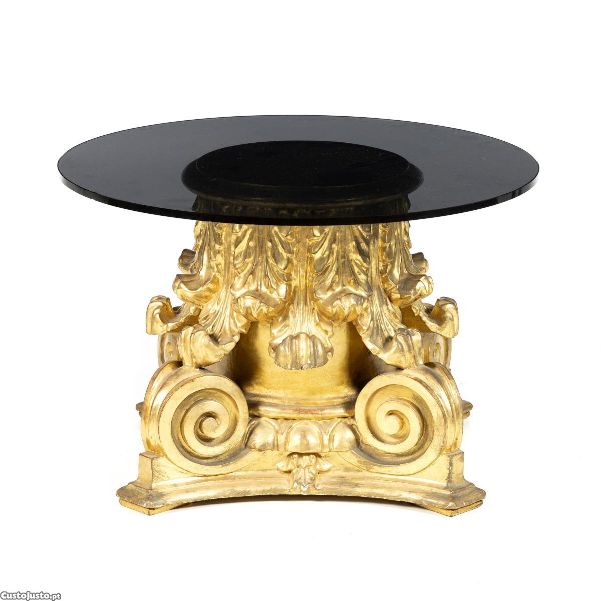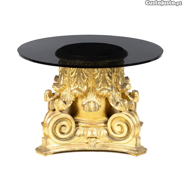 Mesa de centro com base de capitel madeira entalhada e dourada
