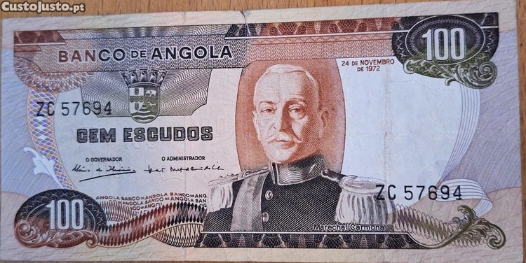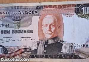 Nota de Cem Escudos de Angola, Marechal Carmona, de 24 de Novembro de 1972.