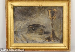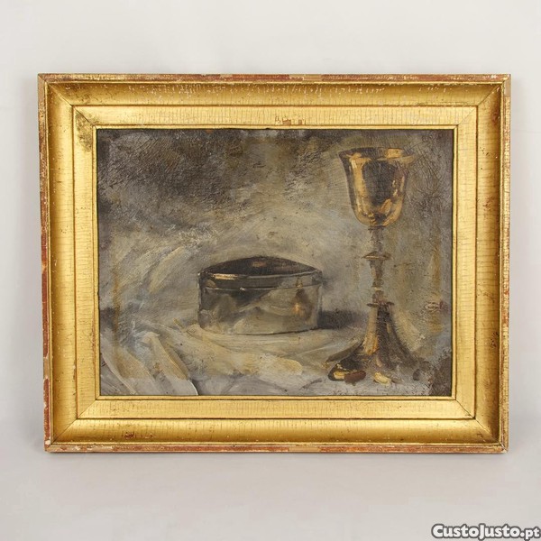 Pintura figurativa em óleo sobre platex representando um cálice e teca eucarística sobre um fundo estilizado. Emoldurado. Assinado e datado no verso 18 Jun 1911 .