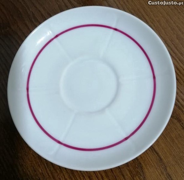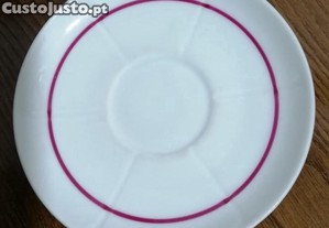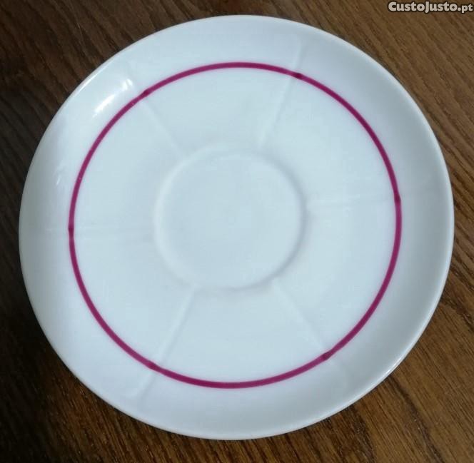 Pires de chávena de chá em porcelana Vista Alegre 1947/68, branco, com filete vermelho e seis caneluras no covo.