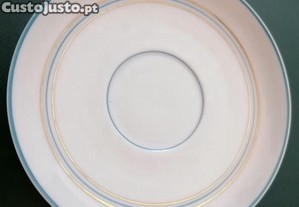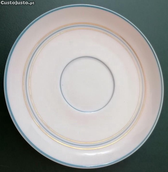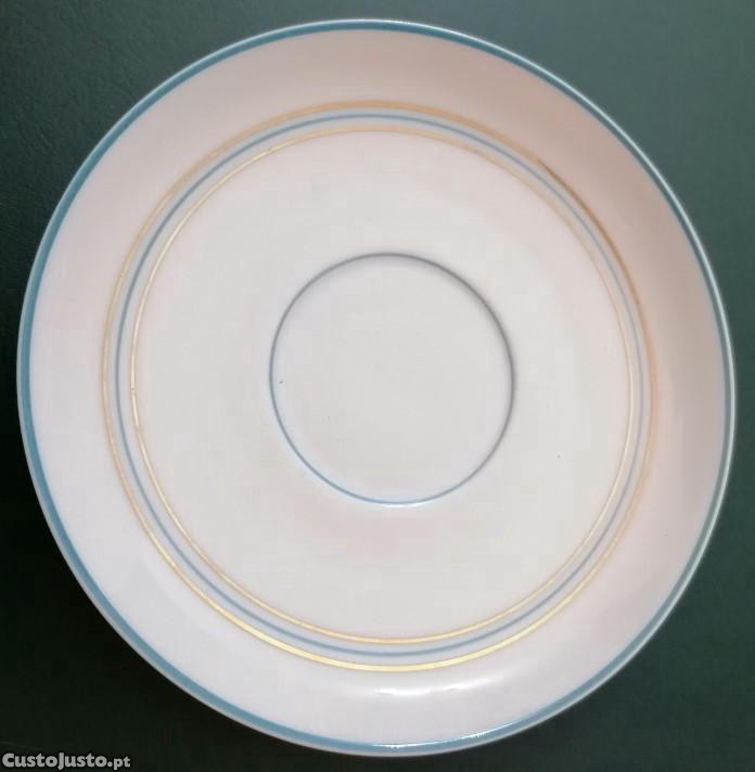 Pires de chávena de café em porcelana Vista Alegre 1947/68, filetes azul e dourado.