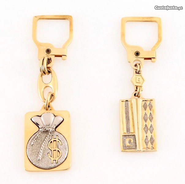 2 porta-chaves da marca Pierre Cardin, em metal dourado com decoração relevada, marca gravada, modelos diferentes.