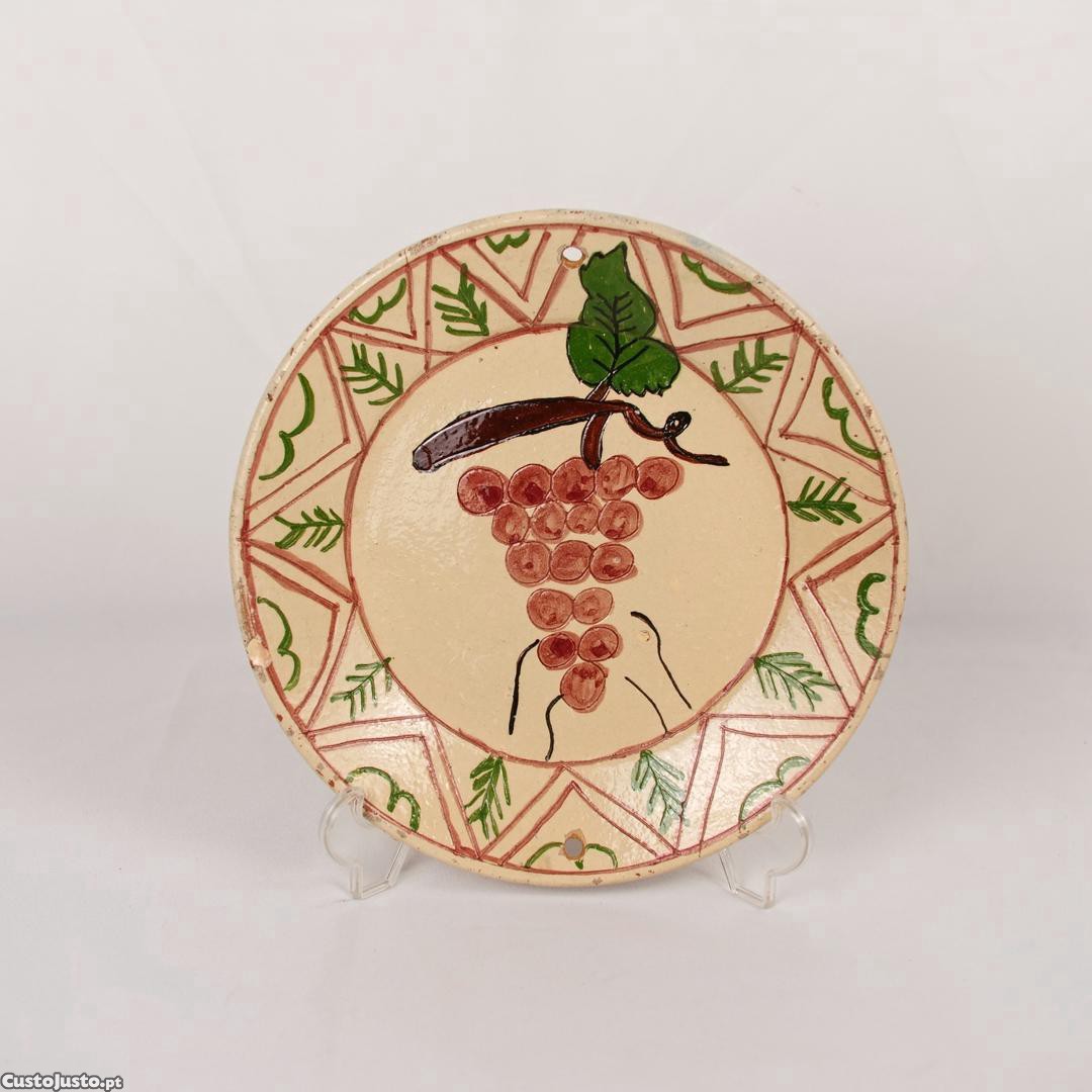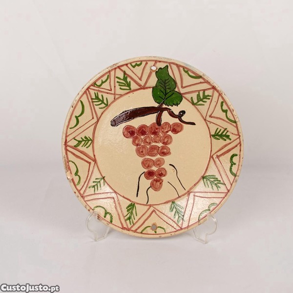 Ao centro representação de um cacho de uvas. Bordo emoldurado por dois filetes e decorado com motivos geométricos e vegetalistas estilizados. Possui dois furos no bordo que permitem a colocação de arame ou fio para pendurar.