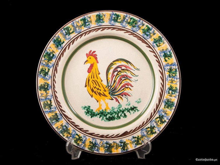 Em faiança portuguesa do Norte, trabalho do séc. XX. Corpo de formato circular de covo acentuado, decorado em vários tons sobre fundo branco, tendo ao centro composição de galo sobre ramagem, ladeado por faixa concêntrica. Aba decorada com esponjados, ladeados por duplo friso concêntrico. Sinais de uso.