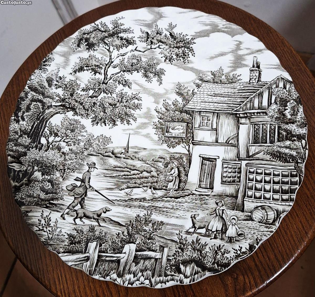 Prato em faiança inglesa Myott (Staffordshire), redondo ondulado a preto e branco, da série "The Hunter", cena de paisagem e caça em estilo campestre inglês, em muito bom estado, com o diâmetro de 25,5cm.