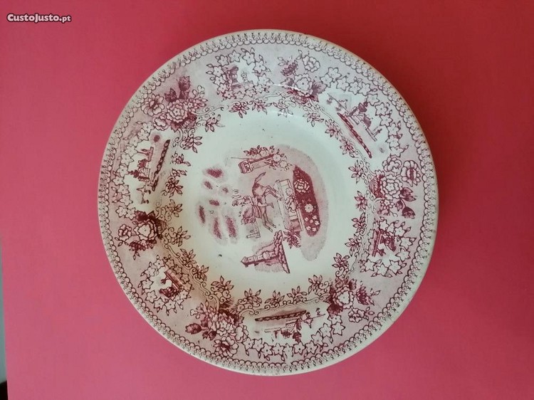 Prato sopeiro em faiança Massarelos, Porto, motivo Estátua, redondo e vermelho, com a aba muito preenchida, e três cabelos visíveis no verso do prato. Tem o diâmetro de 24cm. Condições de entrega à data do anúncio: Grátis, para a entrega em mão no Porto (local e hora a combinar), apenas de artigos de custo igual ou superior a 30EUR, ou: Para outras localidades, dentro do território nacional português, contra o pagamento por transferência bancária do preço acordado, mais custos de envio de 6,00EUR pelos CTT, em correio normal. Para o resto do mundo, só atendo e respondo por e-mail ou WhatsApp, com transferência bancária do preço acordado, mais custos de envio a ajustar. Só envio à cobrança mediante o pagamento antecipado das despesas de envio, por transferência bancária.