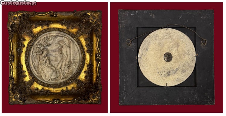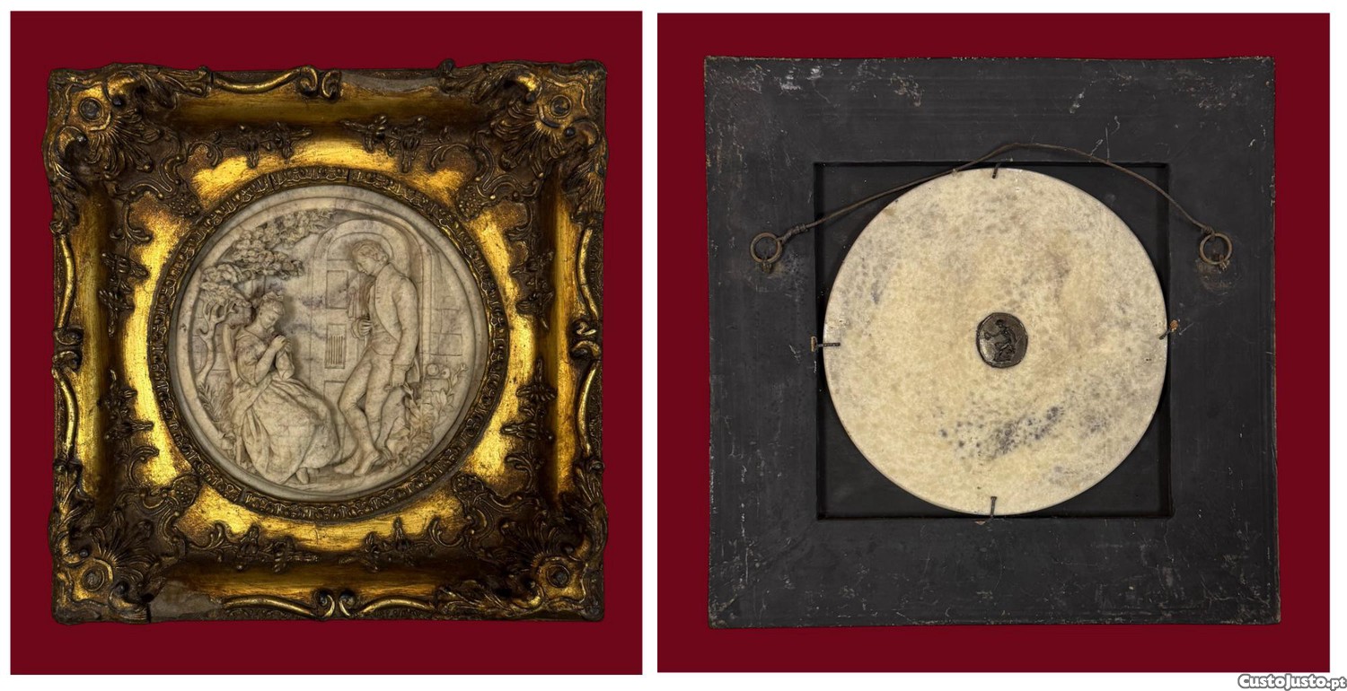 Quadro com placa de alabastro representando Dama e Cavalheiro junto de porta. Marcado.