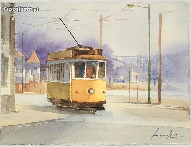 ANTÓNIO NEVES (n.1963) - Original - Pintura a aguarela sobre papel, assinada, motivo "Electrico, da Ribeira até à Foz", com 32 x 41 cm. (sem moldura).