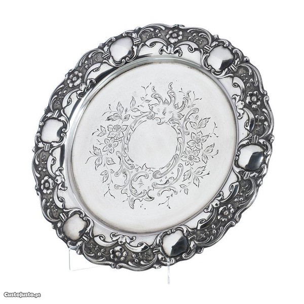 Salva bilheteira em prata portuguesa, contraste javali, decoração de cartelas e elementos florais, aba recortada e relevada e interior inciso.