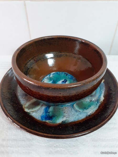 Descrição/Decoração - Peça com prato acoplado , vidrada , tendo no centro da taça e prato vidrados escorridos policromados , cores predominantes azuis, verdes e brancos