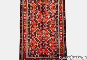 Tapete Persa Sarouk em lã virgem de alta qualidade feito à mão. Design profuso de motivos florais e geométricos intrincados em tons ricos e policromados. Ponto fino com elevada densidade de nós/m2. Tapete de elevada durabilidade.