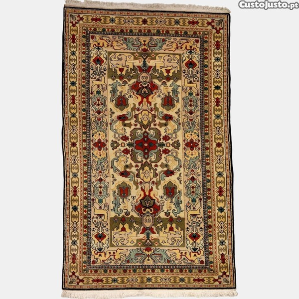 Tapete Persa antigo em lã virgem de alta qualidade feito à mão. Decoração geométrica e floral complexa com faixas decorativas. Cores tradicionais com bege, azul e vermelho.