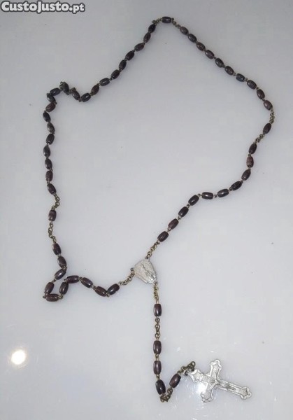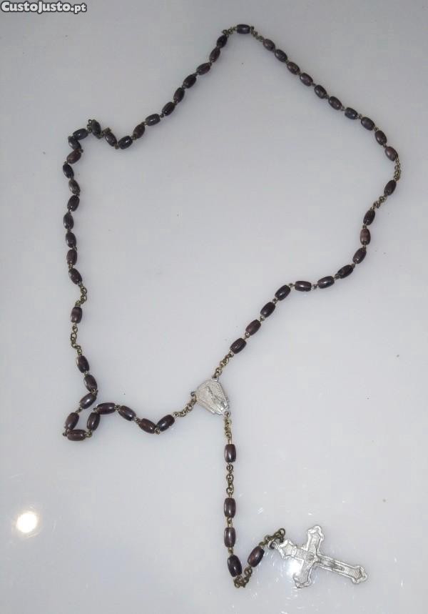 Terço em metal com contas cilíndricas (0,6cm) em baquelite escura e cruz e imagem em alumínio, com o comprimento total de 46cm.