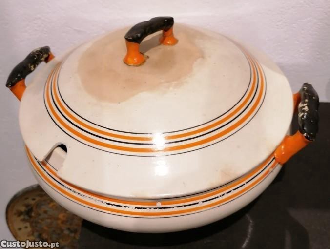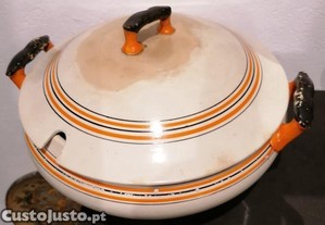 Terrina com sinais de uso, sendo que a pega da tampa está colada.