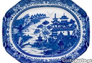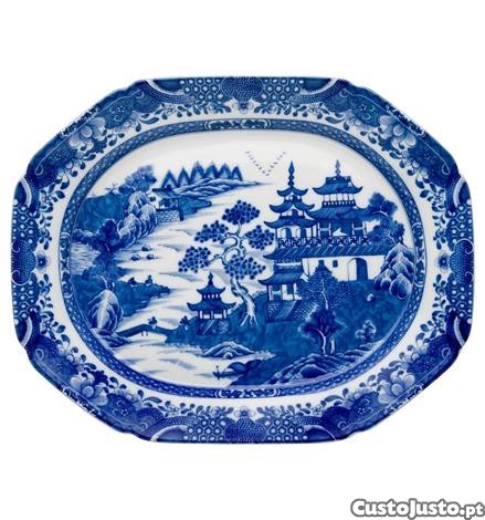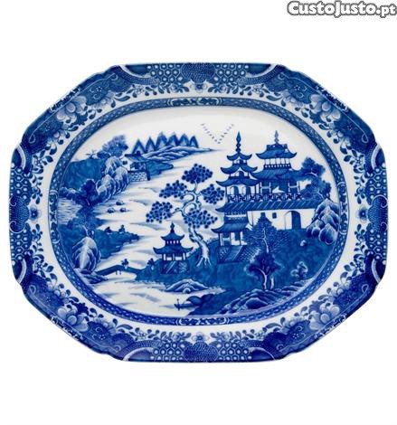 Travessa Média e a grade Blue Canton. A porcelana decorada a branco e azul, nos padrões Cantão e Nanking , foi muito apreciada na era vitoriana e era exclusiva dos mais abastados, fazendo parte das mesas mais elegantes da época.
