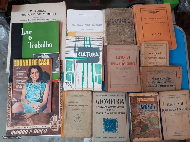 O caderno de problemas de Arim. e Geometria para a 3 classe-coleção Simões Lopes (último livro do canto inf. direito) e o cad. de exerc. e problemas de aritm., sistema métrico e geometria para a 4 classe (livro rosa com uma traineira), ambos na 2 foto, já foram vendidos. Foram também vendidos: Cantando - livro de canto coral; Aritmética elementar de António Trajano; Compêndio de Caligrafia; Clube das donas de casa.