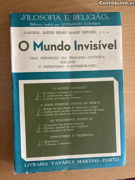 Vendo livro do Cardeal Lépicier O Mundo Invisível, livraria Tavares Martins. Capa um pouco desgastada, interior em bom estado geral, com algumas marcas de passagem do tempo. A retirar junto ao Corte Inglès de Gaia.