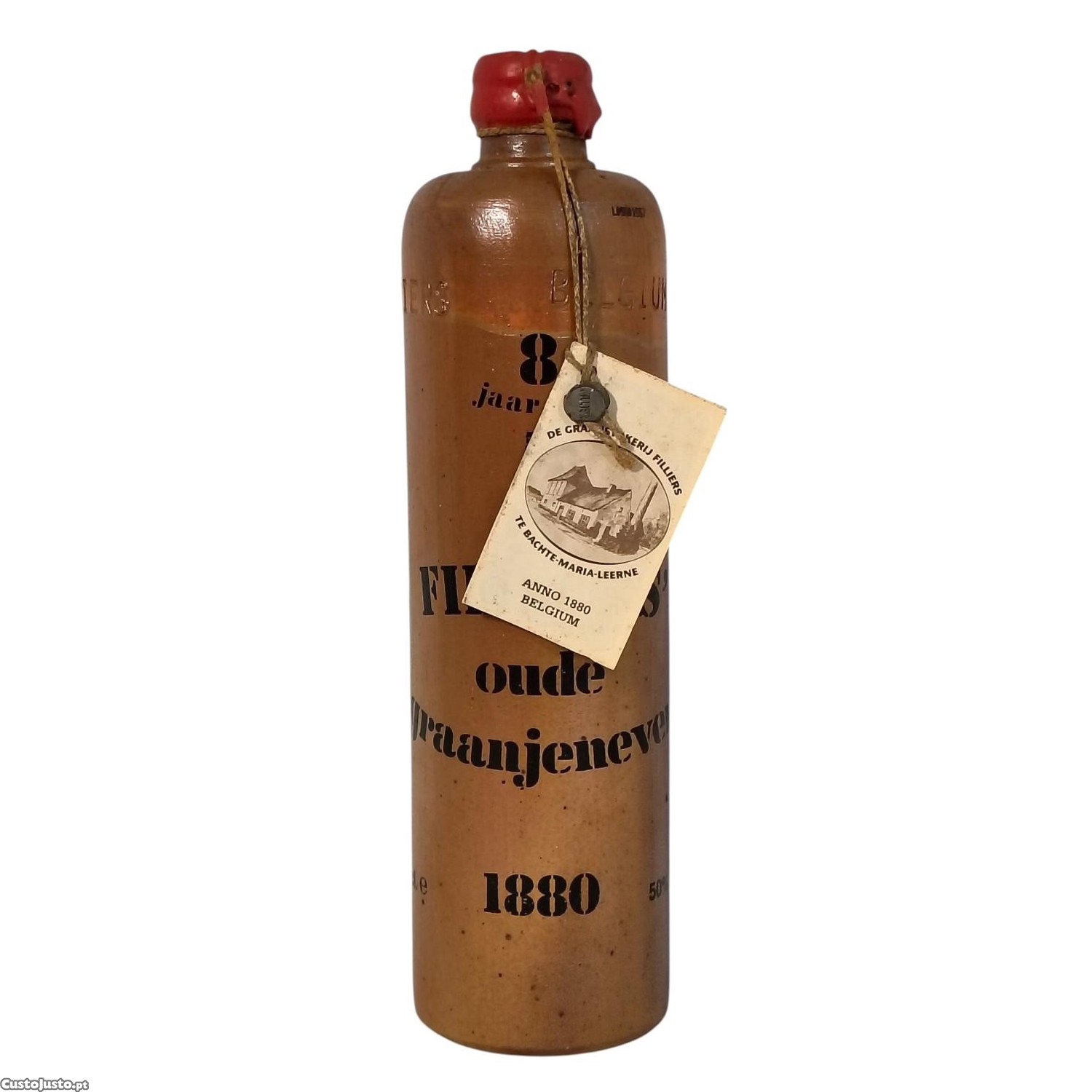Garrafa de Filliers Oude Graanjenever 8 Anos, uma genebra tradicional belga envelhecida em barris de carvalho. Produtor: Destilaria Filliers, localizada em Bachte-Maria-Leerne, na Bélgica. Garrafa de cerâmica clássica da marca.